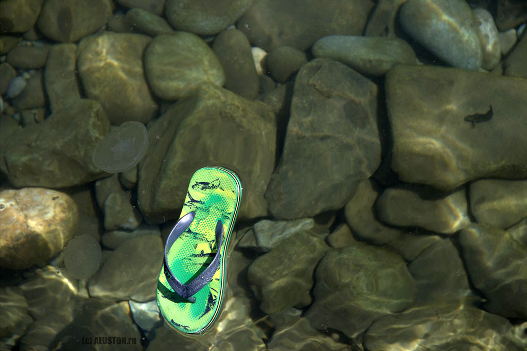 Две медузы, бычок и шлепанец в прозрачной воде. Алушта, восточные пляжи.